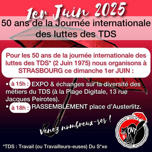 La section syndicale Travail Du Sexe de la CNT STP 67 vous invite à venir à notre rencontre et à échanger avec nous ce dimanche 1er juin 2025 à 15 h à l'occasion de la Journée internationale des luttes des TDS (qui fête ses 50 ans cette année) ! Nous y présenterons la diversité des métiers du Travail Du Sexe et en discuterons avec vous, et bien sûr nous y parlerons aussi de l'actualité de nos luttes. Rejoignez-nous à La Plage Digitale au 13 rue Jacques Peirotes à Strasbourg.