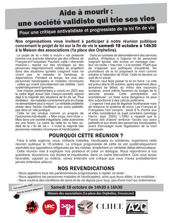Nos organisations (l'UCL, l'URC, les Dévalideuses, le Mask Bloc Alsace, le CLHEE, A2C) vous invitent à participer à notre réunion publique concernant le projet de loi sur la fin de vie.