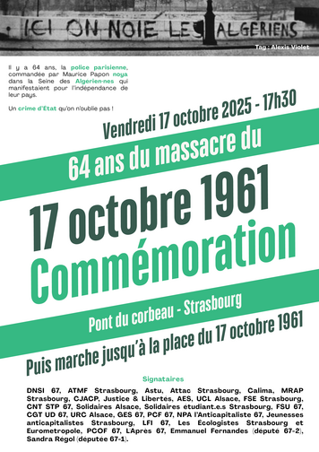 Commémoration le vendredi 17 octobre 2025 au pont Corbeau à 17h30 et en marche vers la place du 17 octobre 1961