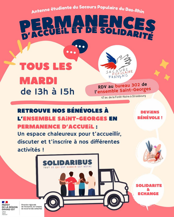 Retrouvez nos bénévoles tous les mardi de 13h à 15h dans le bureau 302 de l'ensemble Saint-Georges dans les locaux de la Mission Solidarité de l'Université de Strasbourg !