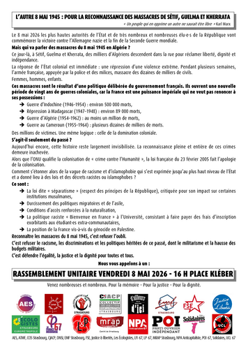 Reconnaître les massacres du 8 mai 1945, c'est refuser l'oubli. C'est refuser le racisme, les discriminations et les politiques héritées de ce passé, dont le militarisme et la hausse des budgets militaires.
