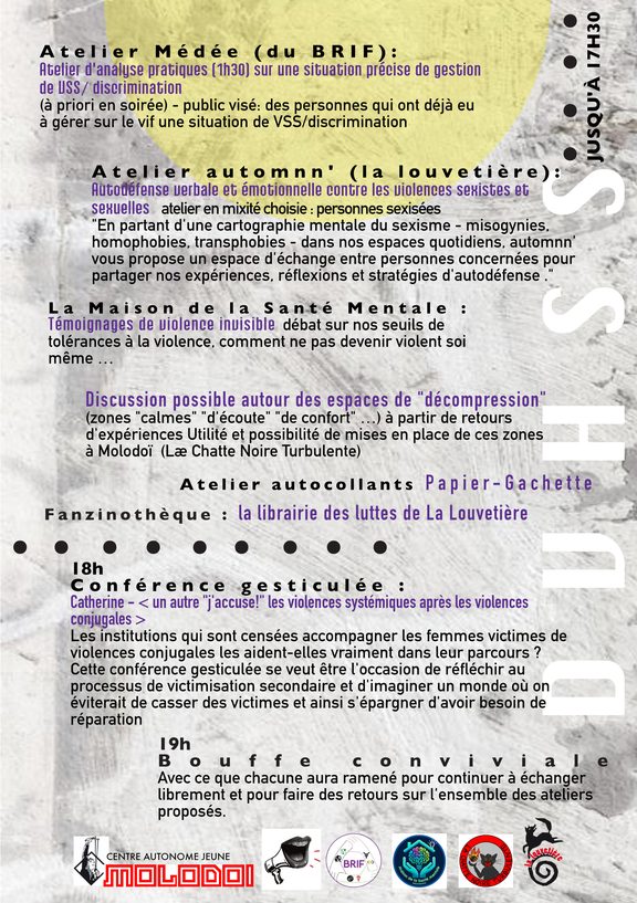 • Atelier Automn' (La Louvetière ) Autodéfense verbale et émotionelle contre les violences sexistes et sexuelles - atelier en mixité choisie : personnes sexisées : "En partant d'une cartographie mentale du sexisme - misogynies, homophobies, transphobies - dans nos espaces quotidiens, Automnn' vous propose un espace d'échange entre personnes concernées pour partager expériences, réflexions et stratégies d'autodéfense."